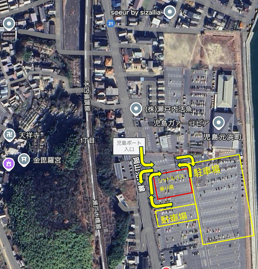 児島駅(のりば①)→ボートレース児島(臨時駐車場)→イベント会場(鷲羽山第2展望台)