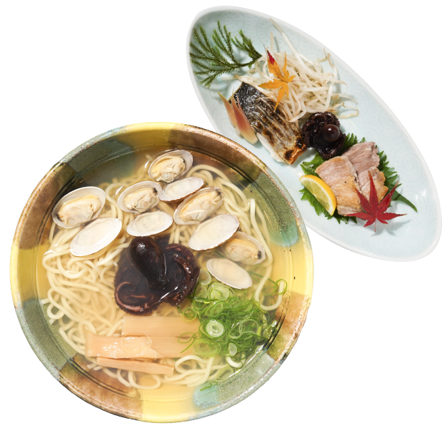 GOURMETカツオ・イリコ・地の魚介類と瀬戸内の食材を使い、日本料理の基本をもとに作り上げた、上品で美しい児島塩ラーメン。 -
